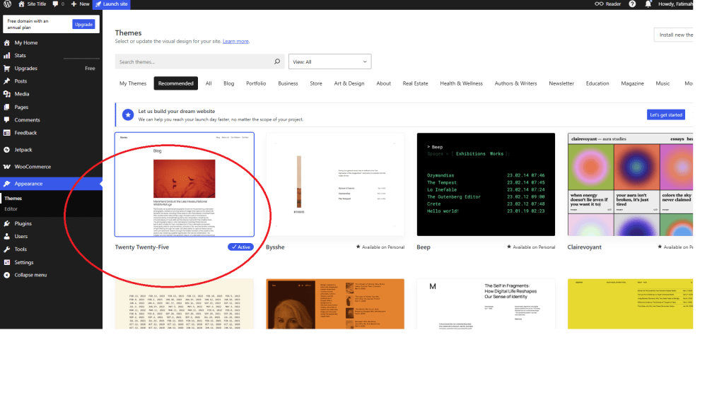 هنا ستختار ثيم المدونة، وهذه خطوة مهمة لأن الموقع لديه عدة قوالب جاهزة لكن بعضها لا يدعم العربية. بالتالي الآن نحتاج لاختيار تيمة تدعم الكتابة من اليمين إلى اليسار.