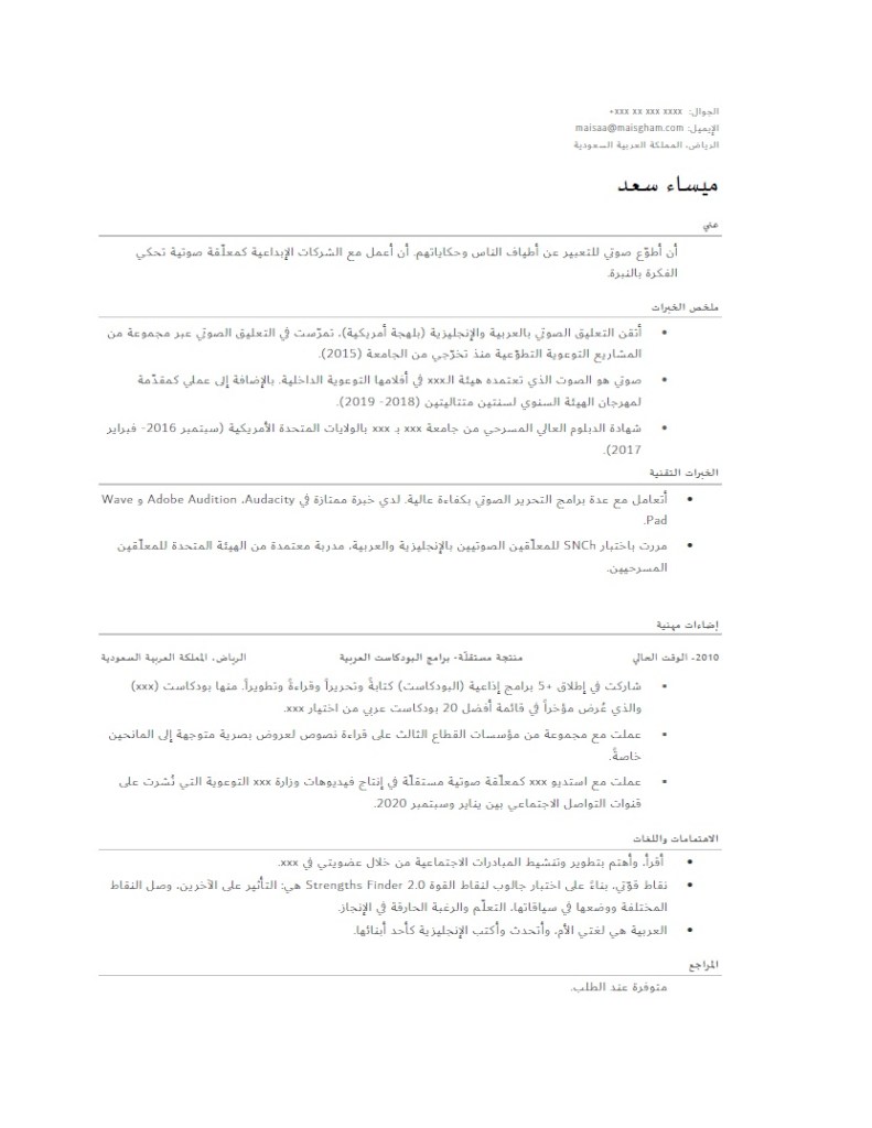 هذه السيرة كتبتها للتعبير عن حالة خاصة. الزميلة التي طلبتها مني تعمل في مجال مختلف تماماً عن المجال الذي تودّ أن تقدّم عليه هذه السيرة. لنقل أنها تعمل في مجال الهندسة، وترغب في الحصول على وظيفة/ عمل مستقل/ في مجال التعليق الصوتي. كيف تكتب سيرتها الذاتية التي تطلبها منها الاستديوهات الإبداعية؟